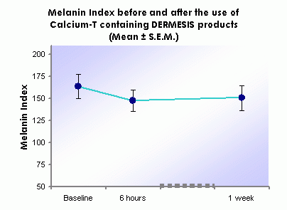 Melanin index on mild dry skin subjects decreased after the use of DERMESIS products, and maintained after one week use. (Baseline: before use)